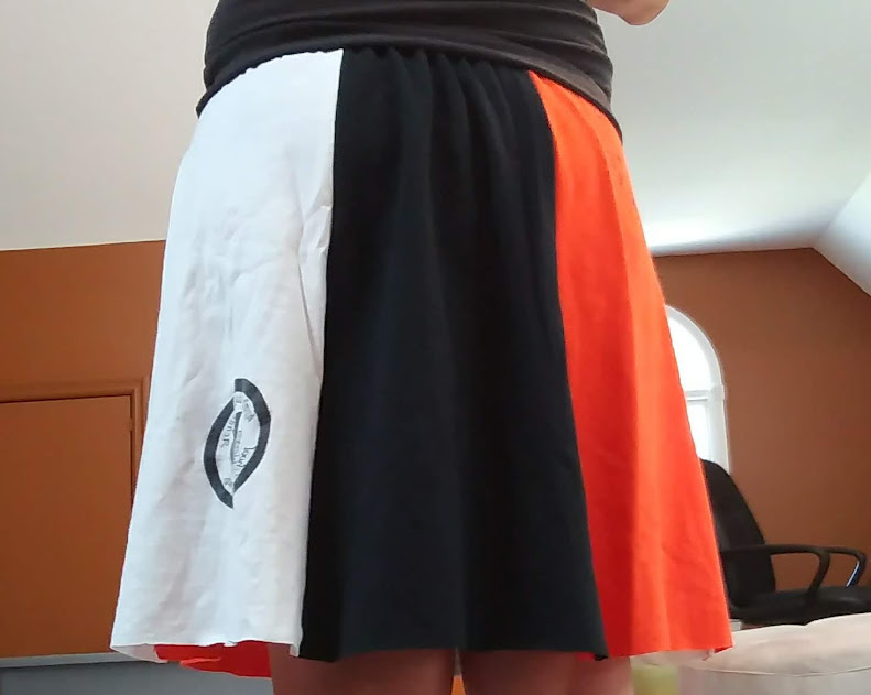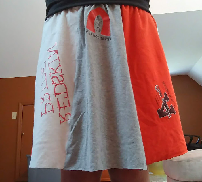 After thinking about it this summer, I decided that I'd use several of these shirts and make a tshirt skirt out of them. I found this site with instructions on how to create a pattern and set forth to do it today.